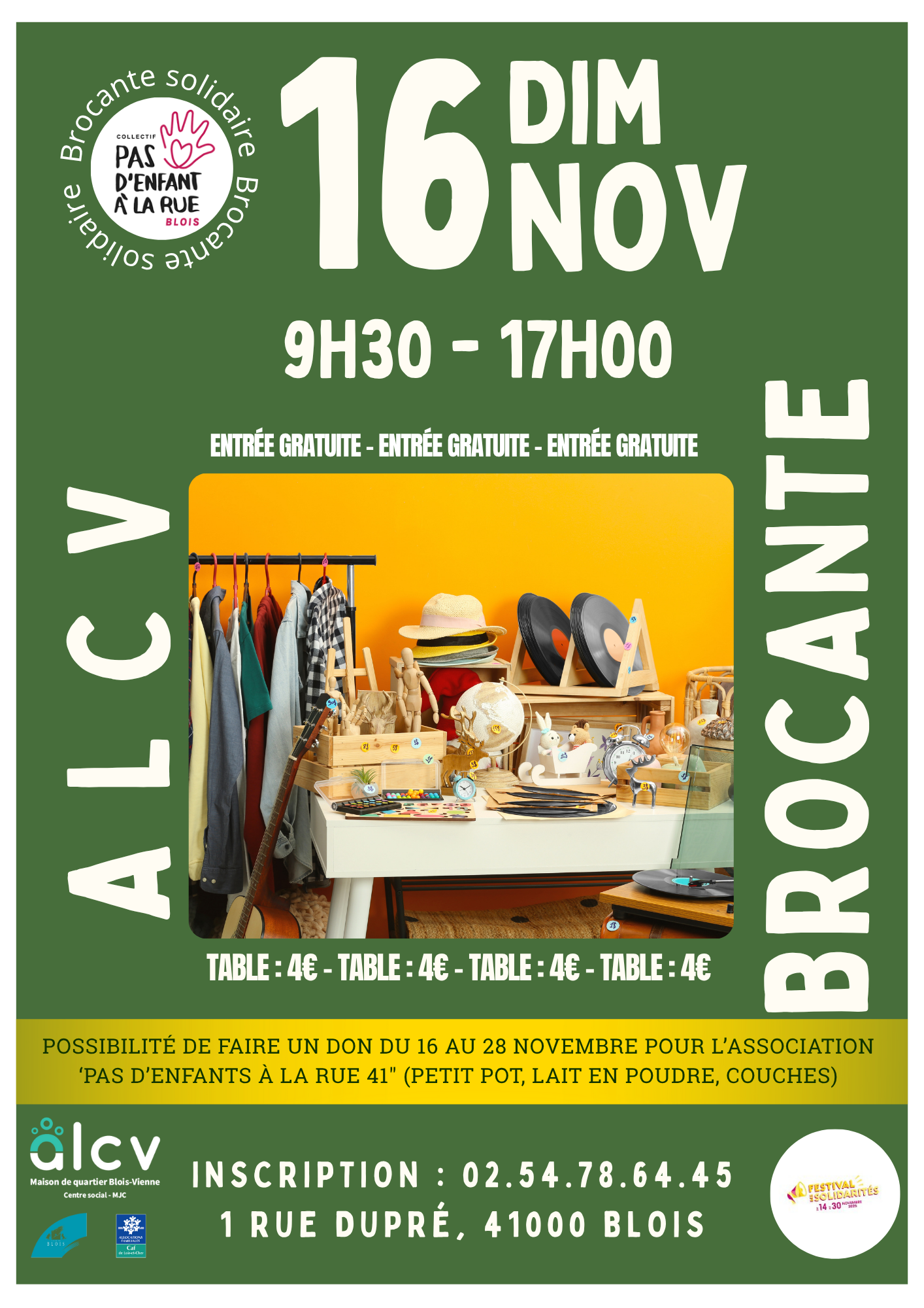 Venez chiner à la Brocante Solidaire de l’ALCV le dimanche 16 novembre (9h30-17h00) ! Une journée pour faire de bonnes affaires tout en soutenant l’association « Pas d’enfant à la rue 41 ».